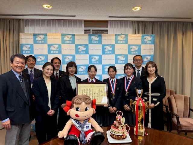 令和7年11月21日 スイーツ甲子園出場生徒、3年生福井せなさん、小泉瀬名さん、2年生瀬川友梨奈さんの3名が優勝報告のため、兵庫県庁に表敬訪問させていただきました。