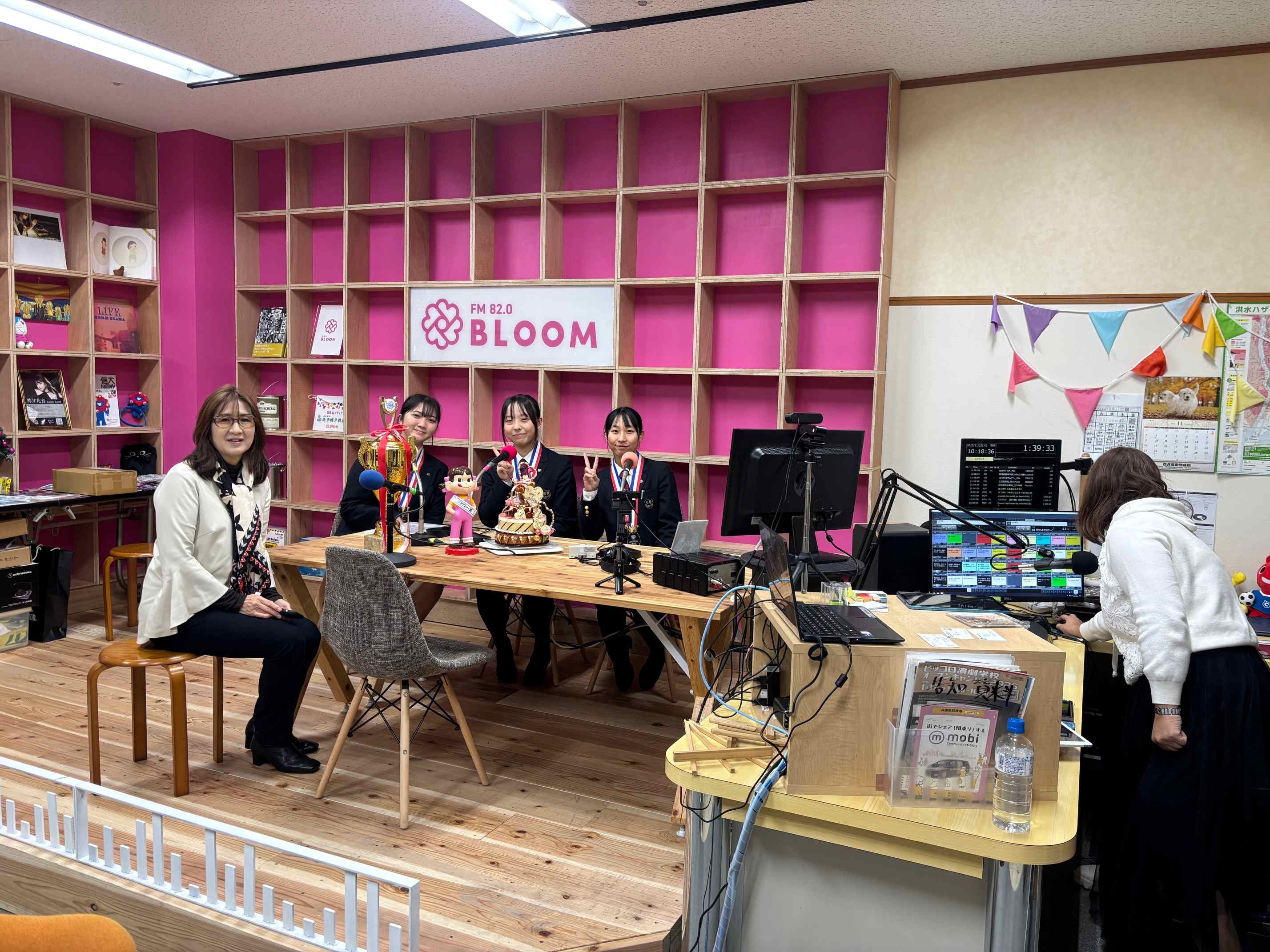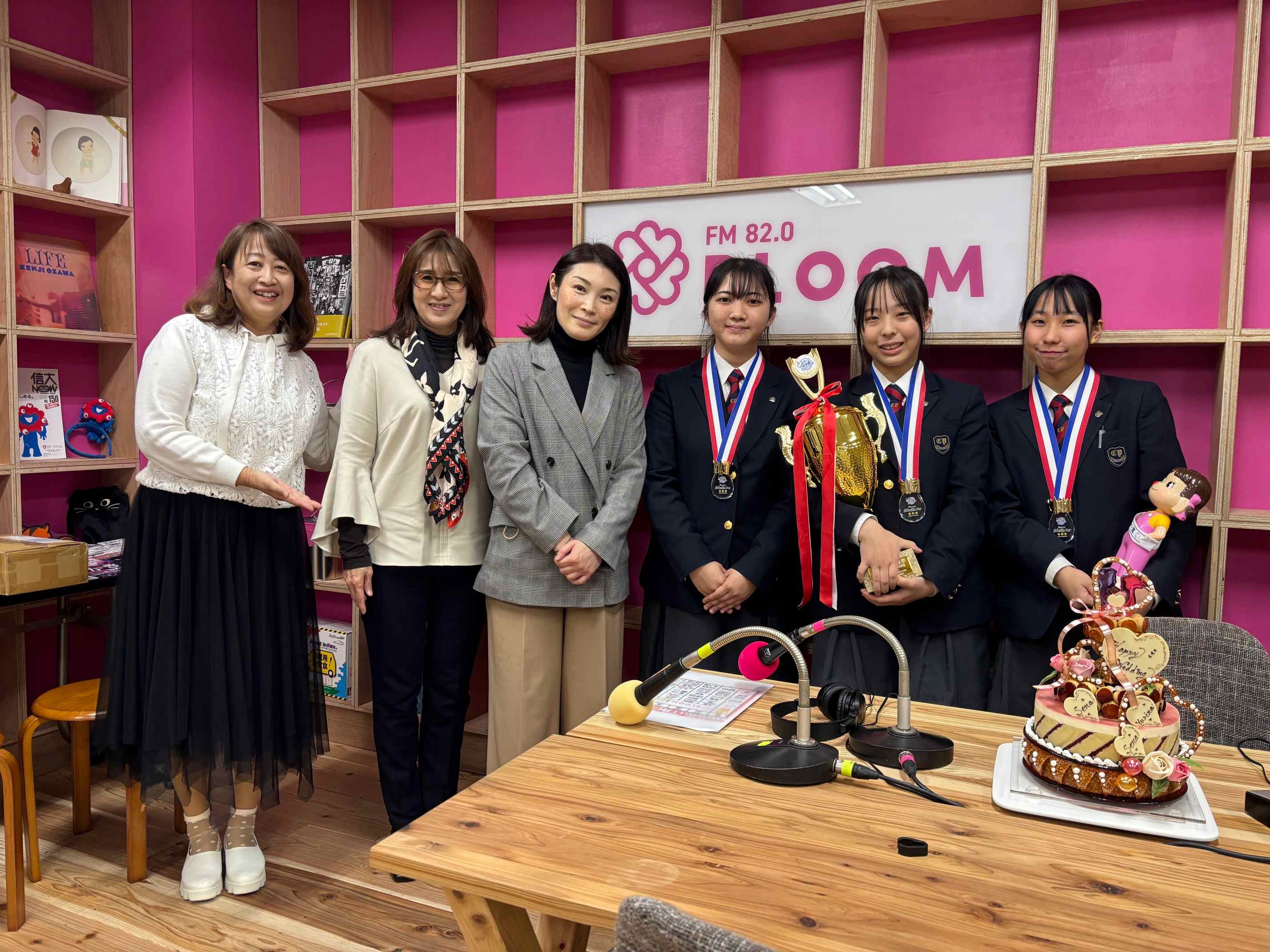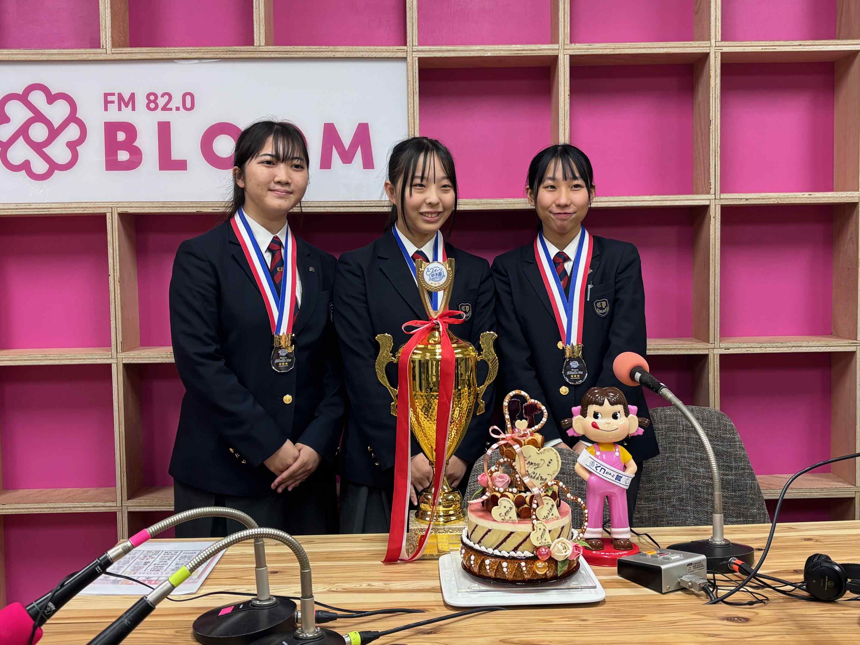 今回はスイーツ甲子園の優勝を機に、校長先生、製菓部顧問の浅香先生、出場メンバーの3年生福井せなさん、小泉瀬名さん、2年生の瀬川友梨奈さんが出演し、大会内容、審査方法、その他日頃の活動についてインタビューを受けました。